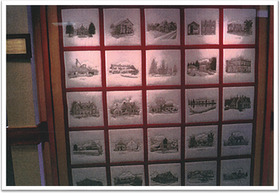 The Heritage Quilt shows ink drawings of pioneer buildings in Wasatch County. Local artist Fred Mertlich did the drawings and they were transferred to beige material. Suzanne Mertlich made the quilt top setting each block with a red border. The Mertlichs donated the quilt top to the Museum. Master quilters of The Daughters of Utah Pioneers Wasatch Company quilted the quilt. The quilt is mounted behind glass at the Museum. It is a very popular artifact.