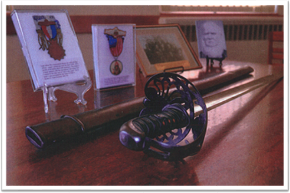 This ceremonial sword and scabert are German made between 1861-65 and purchased for Major John Wesley Witt of the Wasatch Militia in 1866. The militia was organized to provide protection for the settlers. The Ute Indians led by Chief Black Hawk were raiding, stealing cattle and threatening the settlements, The militia was charged to make peace. The medals were awarded to Robert Stone Duke. An ivory pin with an Indian in a head dress and an Indian War Association Medal. Utah War survivors are shown in the photograph.