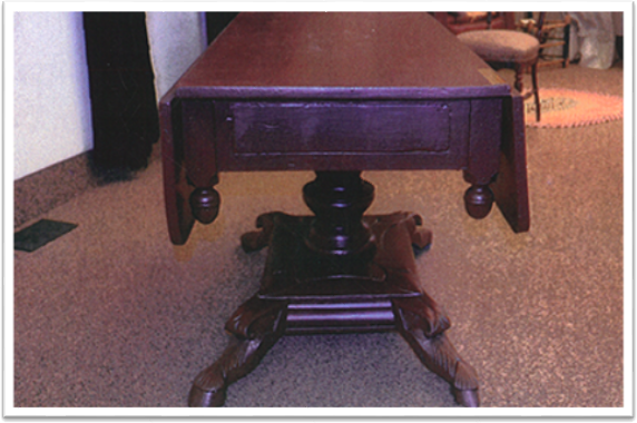 This drop leaf table has a beautifully carved pedestal base. It belonged to Joseph and Sally Murdock. They settled in Nauvoo in 1840. The Prophet Joseph Smith, Hyrum Smith and Brigham Young ate meals at the table, with the family, Joseph died in Nauvoo, he wanted his family to emigrate to the west. Sally and the children joined the Ira Spencer Company and they arrived in Salt Lake, September 22, 1847. The table was among the possessions they brought with them. Sons Joseph Stacy and Nymphus Croidin Murdock settled in the Heber Valley. |